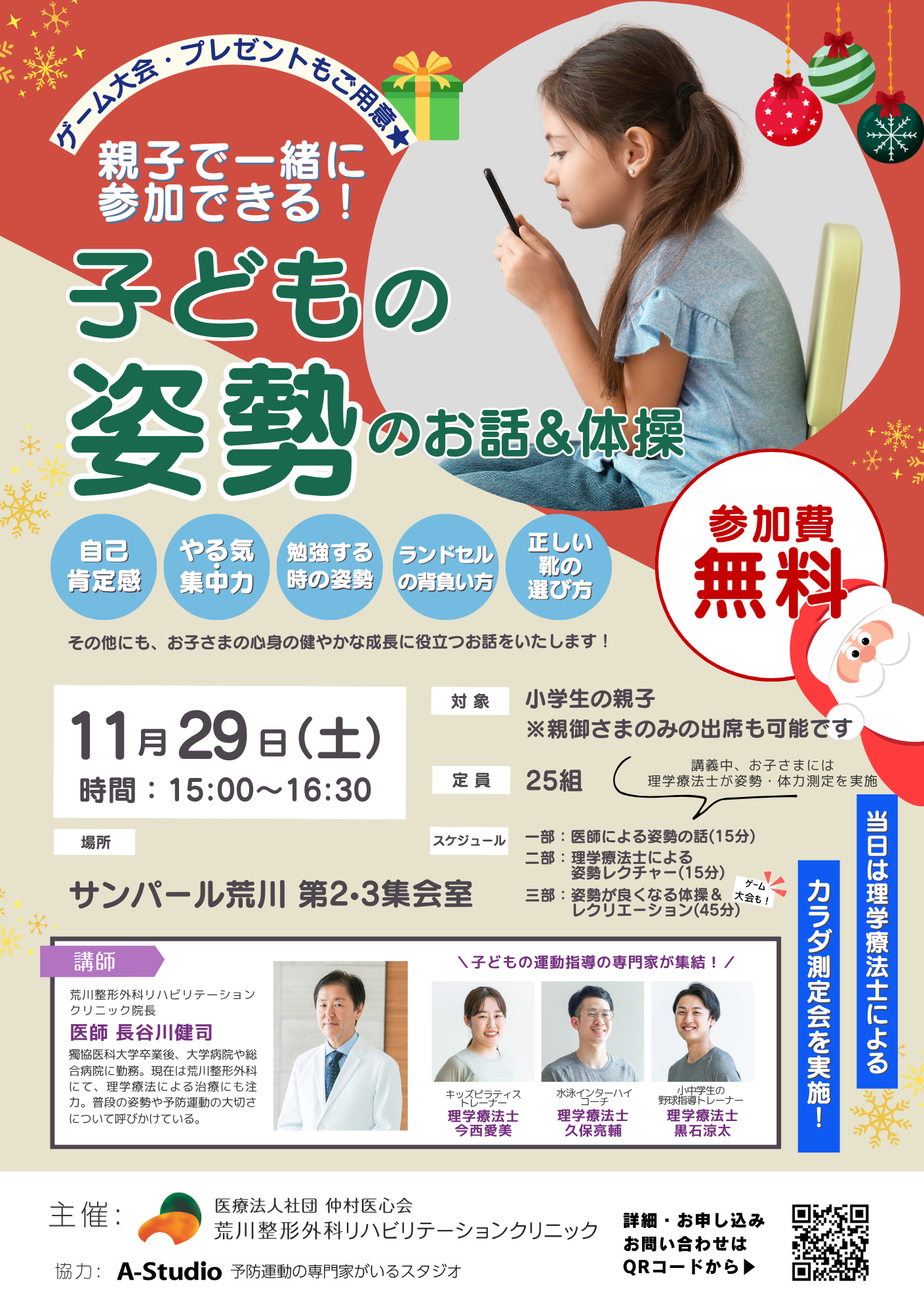 11月29日(土曜日)に、サンパール荒川 第2・3集会室にて、「整形外科医&理学療法士による〝子どもの姿勢のお話&体操〟」(講演会と運動指導など)を開催します。お子様と一緒に参加可能で、参加費は無料です。